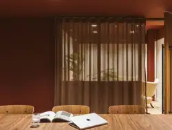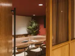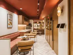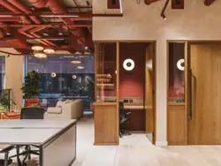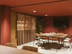 The interiors at One Smart’s Place reject the neutral palette typical of commercial offices. Bold burgundy and scarlet tones, paired with natural materials and warm woods, evoke the atmosphere of an exclusive members’ lounge.