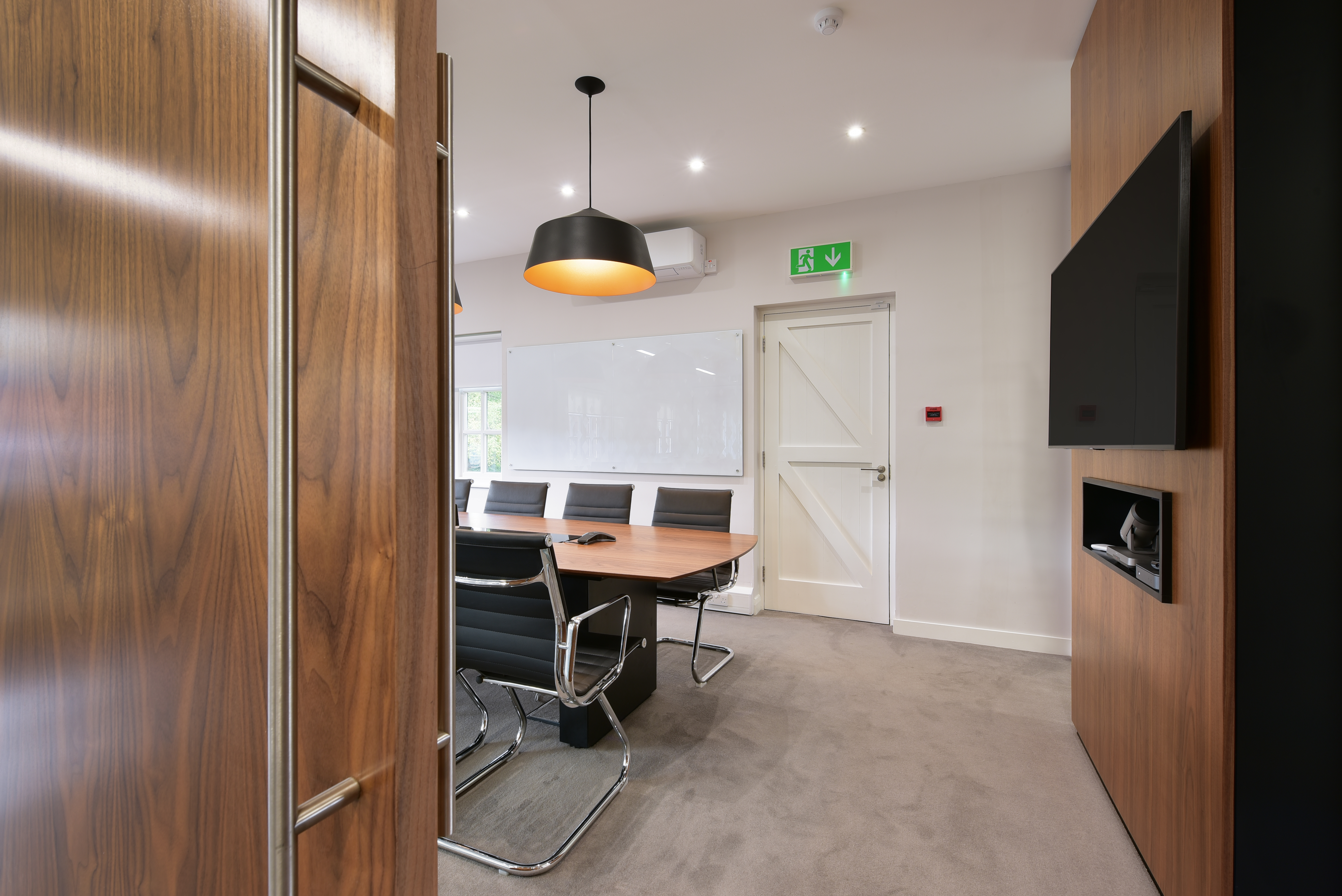 To create a unified consent look throughout the suites crown cut Black American Walnut veneer was selected for its close match to the grain of the table and AV unit in the executive meeting room. To ensure the veneers matched, Forza was sent a sample of the desk veneer and personally selected the veneer to match. We also used the same veneer on the doorframes and the Forza Imola partitions for continuity of colour and grain.