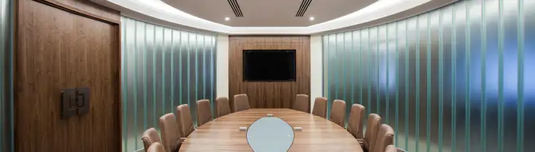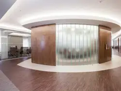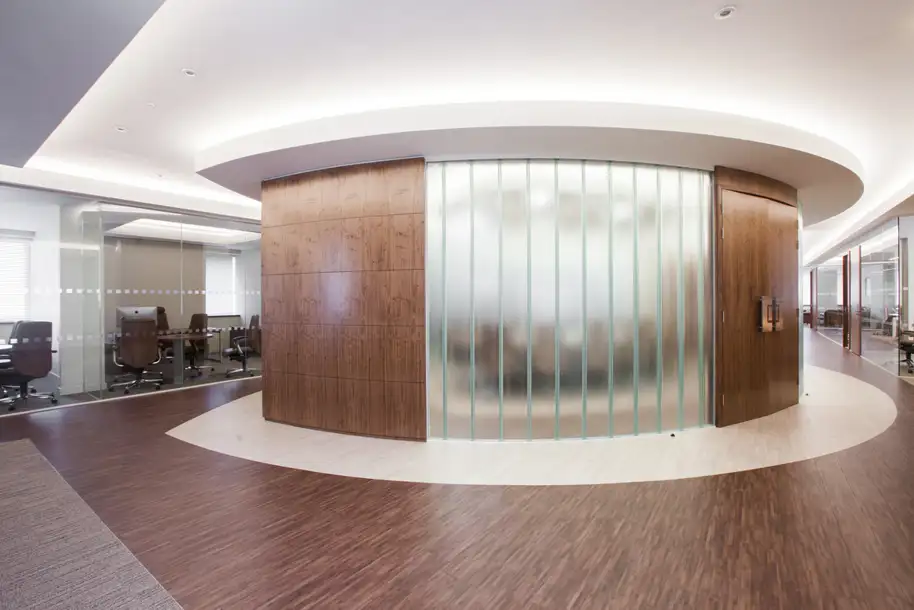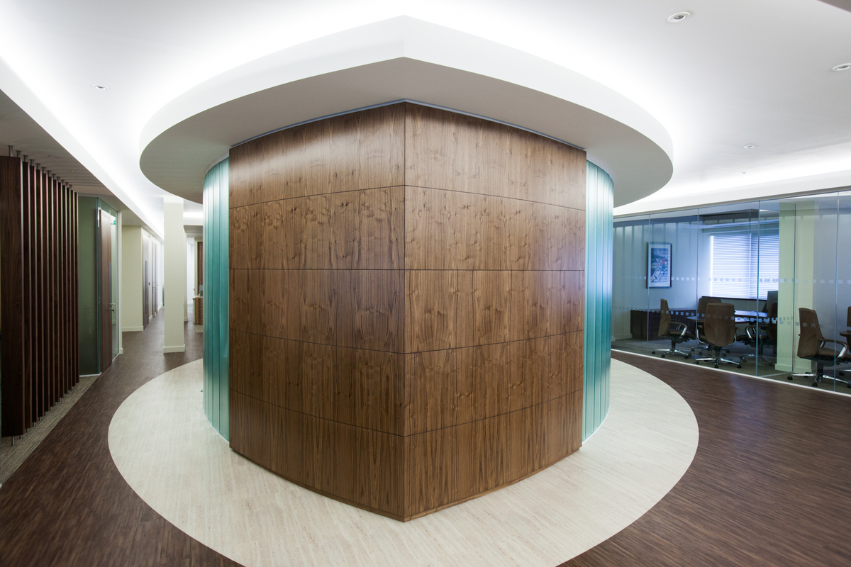 The challenge for the Vibe and Forza teams was to design within budget the central meeting area with a visually curved effect by the use of facetted glass panels, sectional veneer panels and a unique double door and frame set.