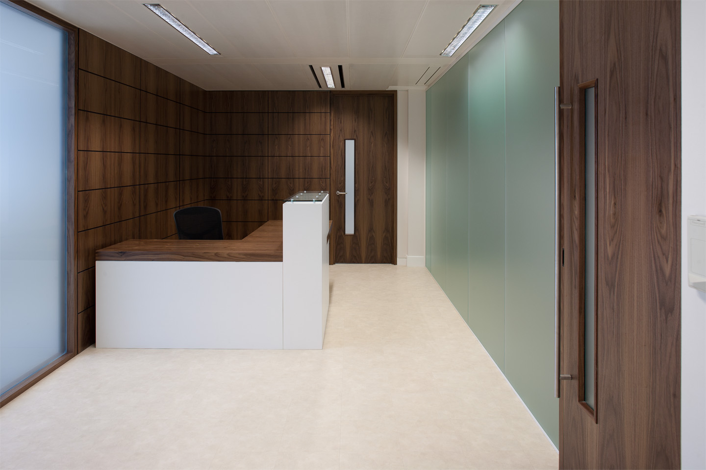 Sequentially matched American Black Walnut veneer doors and frames integrated with a single glazed aluminium partition system formed the cellular offices.